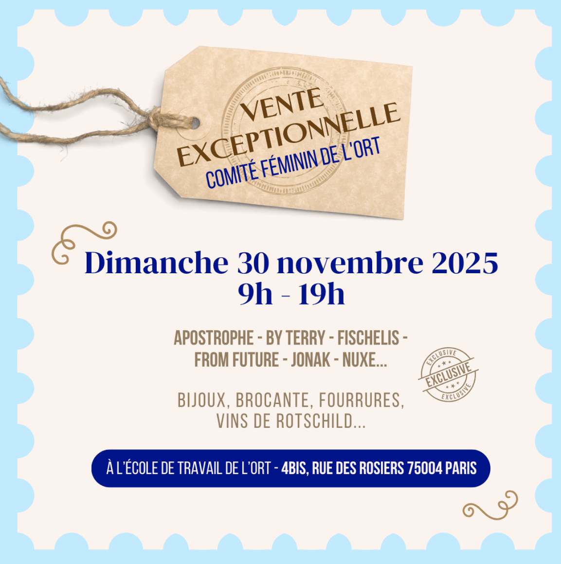 VENTE ANNUELLE 30 NOVEMBRE 2025 2 fois par an le Comité Féminin de l'ORT organise une vente au profit des élèves du réseau ORT qui en auraient besoin (bourses, cantine ...). La prochaine opération a lieu le dimanche 30 novembre 2025 : Affiche du 30 novembre 2025. Philippe Alfandari2025-10-20T15:43:52+02:00